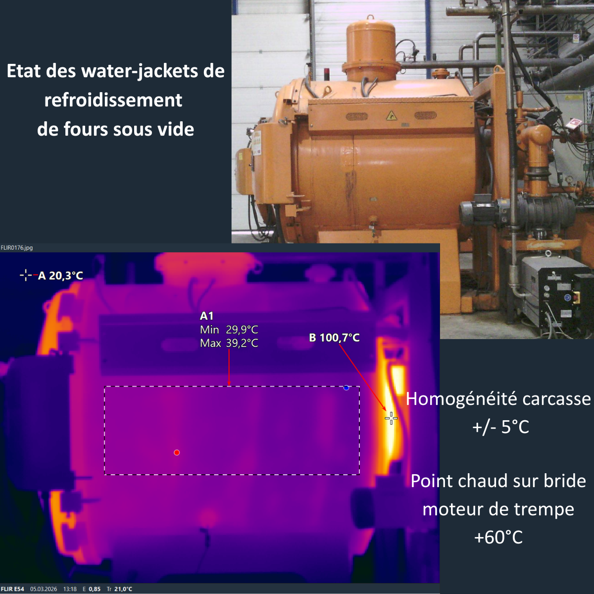 Quelle que soit le cas d'application, nous utilisons les méthodes et les caméras thermiques qualifiées par le CNPP, selon le référentiel D19 (permettant la délivrance du certificat Q19). La précision élevée de notre matériel associée à la maîtrise de l'environnement de mesure permet de garantir une précision jusqu'à +/- 2°C.